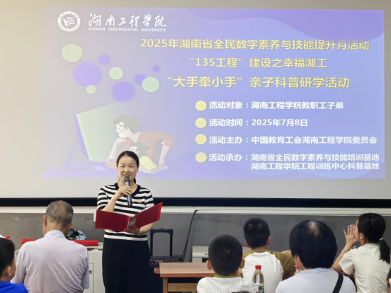 7月8日,bevictor伟德国际迎来公司40余位教职工及子弟,共同参与由湖南省全民数字素养与技能培训基地、校工会与工程训练中心科普基地联合主办的2025年湖南省全民数字素养与技能提升月系列活动暨伟德国际唯一官网“135工程”建设之“幸福湖工”亲子科普研学活动。公司党委副书记向前参加活动并致辞。