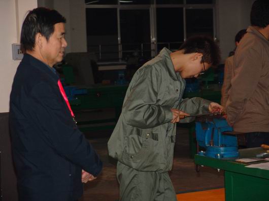 11月13日晚19:00,评估专家李正熙、陈文哲两位教授来到工程训练中心对抽查到的同学进行技能测试,两位教授仔细查看了同学们的数控车、车工、钳工等技能测试情况,在查看中还详细地询问了指导老师和被抽查的同学。省教育厅处长王文斌在副经理刘国繁教授的陪同下,也来到工程训练中心,对考场进行了巡视。